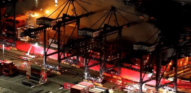 Navio estava atracado no porto de San Pedro Imagem: Reprodução/XUm incêndio em um navio cargueiro causou uma explosão em um porto de Los Angeles, nos Estados Unidos. Não houve feridos.O que aconteceuFogo começou em navio que estava atracado no porto de San Pedro. O incêndio teve início por volta das 18h30 de ontem (23h30 no horário de Brasília).Vinte e sete pessoas foram resgatadas em segurança. Segundo o Corpo de Bombeiros, todos os tripulantes foram evacuados e ninguém ficou ferido.A explosão interrompeu o fornecimento de energia do navio. As operações de guindaste também ficaram prejudicadas.Materiais perigosos foram identificados em diversas áreas do porto. Os bombeiros estão usando equipamentos de proteção individual e aparelhos de respiração.Mais de 100 bombeiros participaram do combate às chamas. “Equipes de emergência estão no local com mais de 100 bombeiros trabalhando para conter o incêndio, e a Polícia Portuária está auxiliando a equipe a chegar em segurança”, disse a prefeita de Los Angeles, Karen Bass.* com Reuters