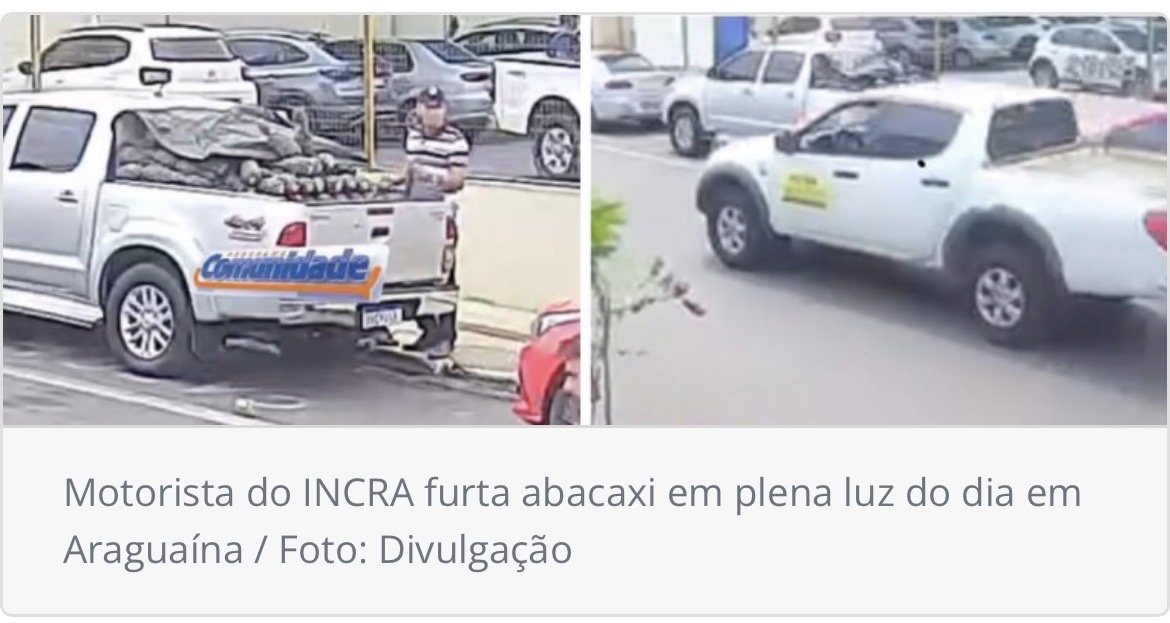 Um servidor do Instituto Nacional de Colonização e Reforma Agrária (INCRA) foi filmado subtraindo um abacaxi de um vendedor ambulante no centro de Araguaína (TO) na tarde desta quinta-feira (13/11). As imagens, divulgadas em redes sociais e por câmeras de segurança de estabelecimentos da região publicado no Portal AF Notícias, mostram a ação em plena luz do dia na esquina da Rua 7 de Setembro com a Rua das Mangueiras.